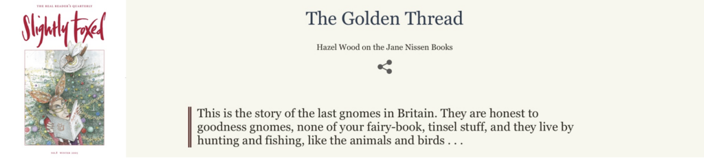 In 2005, Slightly Foxed – ‘The magazine for people who love books’ – carried articles about Kaye Webb – Nuffin’ Like A Puffin – and Jane Nissen – The Golden Thread. Click the link to subscribe or buy back issues.